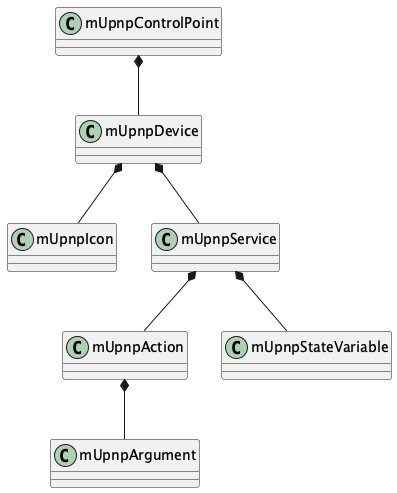The following static structure diagram is related classes of mUPnP to create your control point of UPnP™. The control point has some root devices in the UPnP™ network.