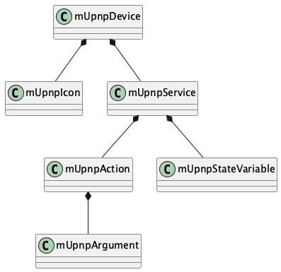 The following static structure diagram is related classes of mUPnP to create your device of UPnP™. The device has some embedded devices and services, and the services have some actions and state variables.