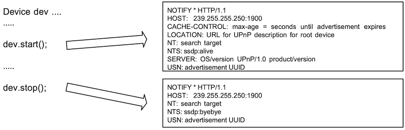 Your device is announced using mupnp_device_start() to the UPnP™ network using a notify message with ssdp::alive automatically when the device is started. When device is stopped using mupnp_device_stop(), a notify message is posted with ssdp::byebye. You can announce the notify messages using mupnp_device_announce() and mupnp_device_byebye().