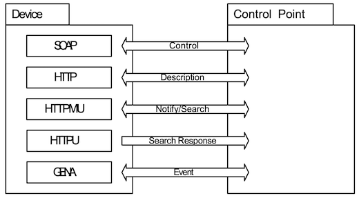 UPnP™ architecture is based on many standard protocols, such as GENA, SSDP, SOAP, HTTPU and HTTP. Therefore you have to understand and implement these protocols to create your devices of UPnP™.